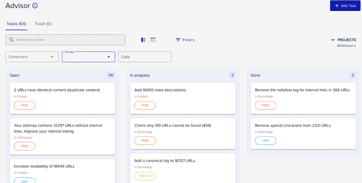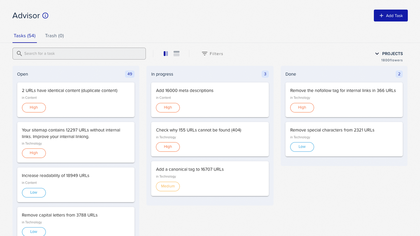 Имайте предвид, че имате нужда от Проект за да работи функцията Advisor. Освен това повечето от задачите на съветника са съобразени с уебсайта на проекта (обикновено ваш или на вашия клиент). Ако управлявате повече от един уебсайт, ще трябва да създадете допълнителен проект за всеки от тях.
