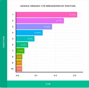 Добър въпрос. Проучванията показват, че 31,7% от потребителите кликват върху първия органичен резултат от търсенето (първа позиция); огромните 75,1% от всички кликвания отиват до първите три резултата от търсенето. След това броят на кликванията бързо намалява с всяка следваща позиция.